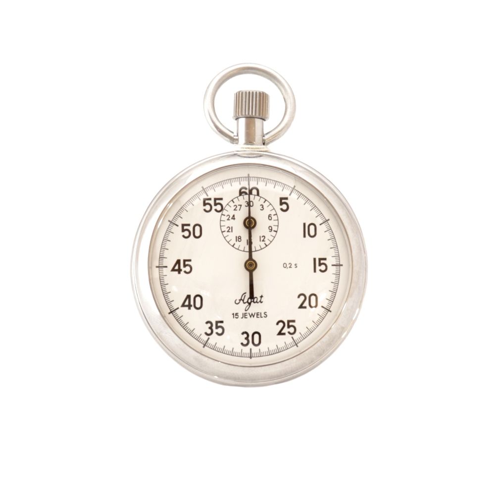 Секундомер выполнен в металлическом хромированном корпусе, его циферблат покрыт белой эмалью, цифры и стрелки – черной. Противоударной защиты узла баланса данная модель не имеет.